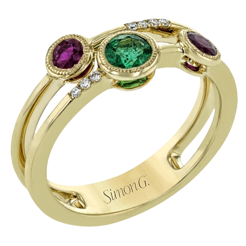 This modern 18k yellow gold double-banded ring features several bezel set gemstones including .36 ctw of rubbies, .28 ctw of emeralds, and .04 ctw of accent diamonds.