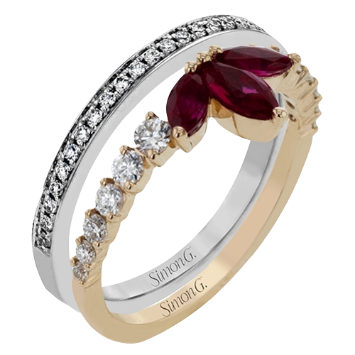This distinctive two-tone 18k gold ring gives the look of two stacked rings in one, with three rubies in a central floral shape, flanked by .59 ctw of white diamonds.