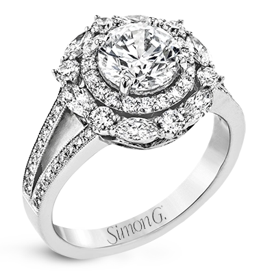 Rows of diamonds create a stunning effect in this 18k white gold engagement ring made for a round diamond. A total of .65 ctw of round diamonds and .35 ctw marquise diamonds surround the center stone.