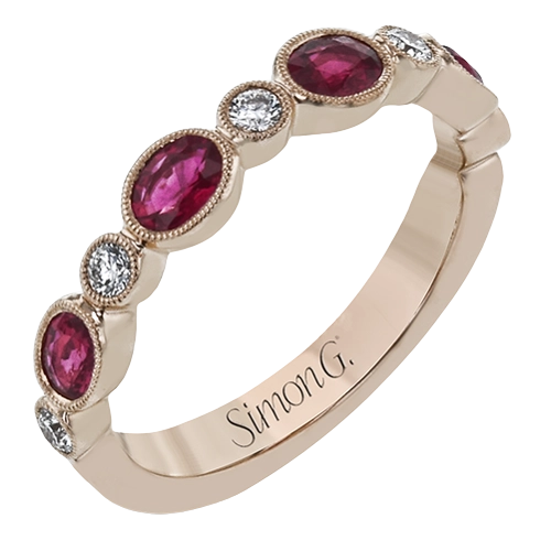 This lovely 18k rose gold band is perfect for stacking but can also stand on its own. Beautiful rubies are paired with .16 ctw of diamonds.