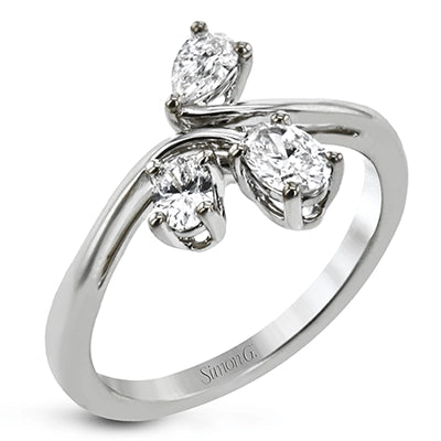 This new take on a three stone design features a .15 ct pear shaped diamond and .43 ctw oval diamonds in a cluster.