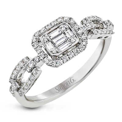 Vintage inspired yet modern, this white gold ring features a central emerald shaped mosaic of diamonds and a striking chain-like design on the band.