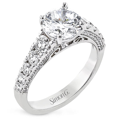 Filigree details underneath the center stone and diamonds that extend down the sides of this ring make it far from ordinary.