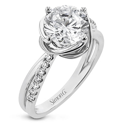This criss-cross design engagement ring shimmers with 0.15 ctw round diamonds and a halo of gold strands wrapped around the center