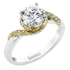 Contemporary 18 kt two-tone engagement ring has a swirl of white diamonds .24 ctw, set in yellow gold on a polished white gold shank