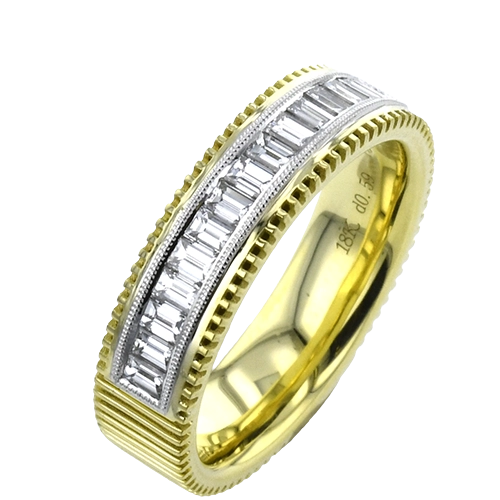 A striking 18K two toned ring with a ribbed yellow gold band and a row of baguette diamonds 0.59 ctw., in a delicate white gold beaded channel