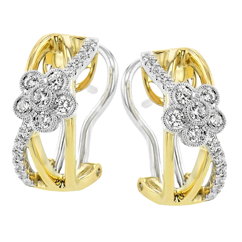 These nature inspired earrings 0.33 ctw. in 18K 2tone, adorn your ears with warm yellow gold bars highlighted by a swirl of white diamonds and a diamond flower design.