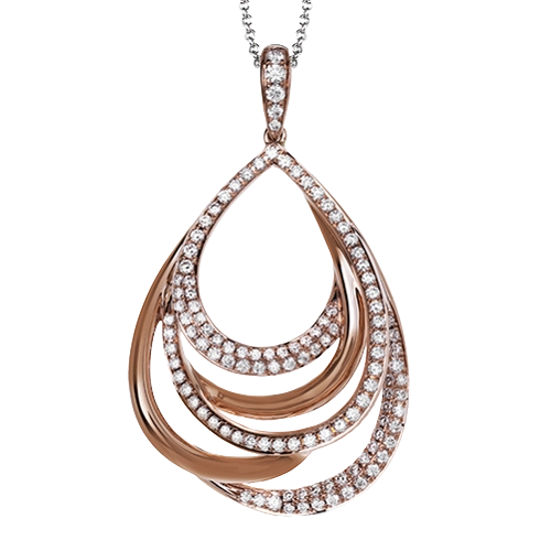 Featuring multiple intertwined teardrop designs, this contemporary rose gold pendant is accentuated by the presence of .83 ctw round cut white diamonds.