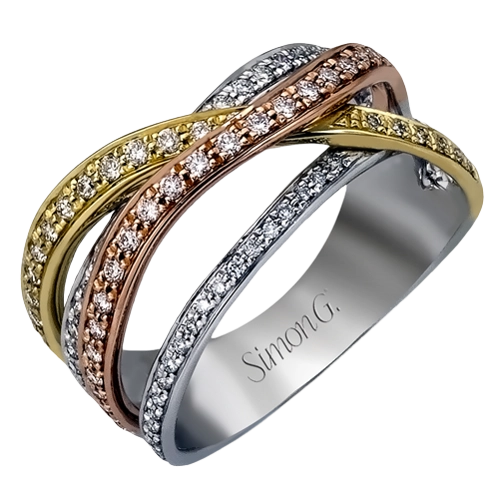 Featuring an intricately entwined contemporary design, this tri-tone ring is highlighted by .42 ctw of round cut white diamonds in rose, yellow, and white gold.