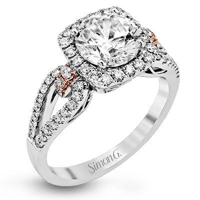 The delicate romantic design of this vintage inspired white and rose gold engagement ring and wedding band set is accentuated by .45 ctw of white diamonds and .08 ctw of pink diamonds.
