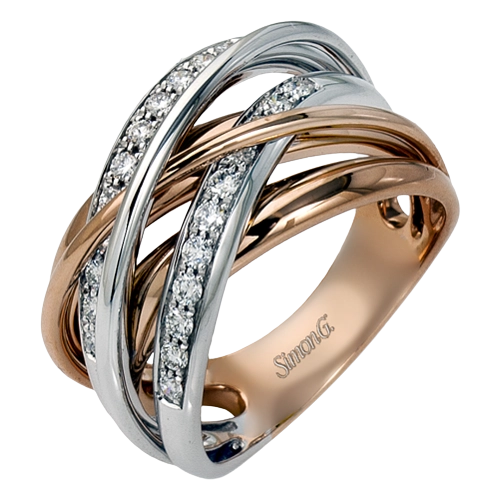 The intertwined design of this contemporary two-tone band is highlighted by .36 ctw of glistening round cut white diamonds set in rose and white gold.
