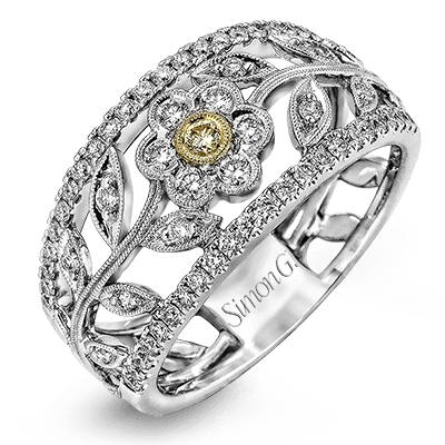 The delicate floral design of this white and yellow gold band is complemented by .53 ctw of round cut white diamonds and .04 ctw of round cut yellow diamond accents.