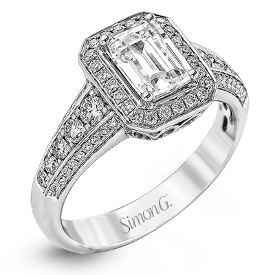 This romantic white gold engagement ring is complemented by .57 ctw of sparkling round cut white diamonds in a vintage-inspired setting.