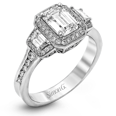 Featuring a lovely romantic setting, this white gold contemporary ring features an exquisite halo and .33 ctw of shimmering round cut white diamonds complemented by .34 ctw of trapezoid side diamonds.