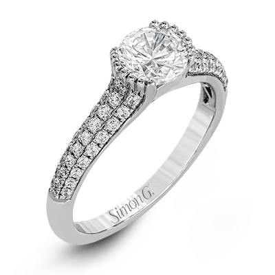 A modern take on a classic design, this white gold engagement ring is accented by .35 ctw of round cut white diamonds.