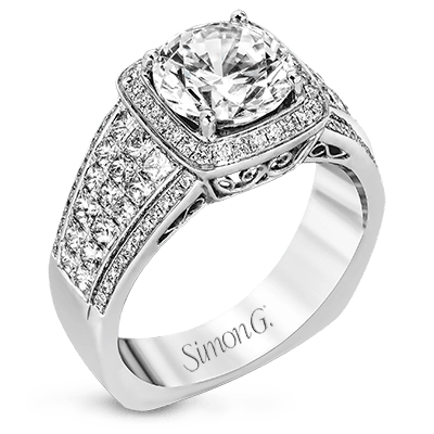 This romantic white gold contemporary ring is accentuated by .25 ctw of glistening round cut white diamonds and .94 ctw of princess cut diamonds.