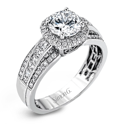 Featuring an impressive halo, this contemporary white gold engagement ring is accented by .22 ctw of round cut white diamonds and .42 ctw princess cut diamonds.