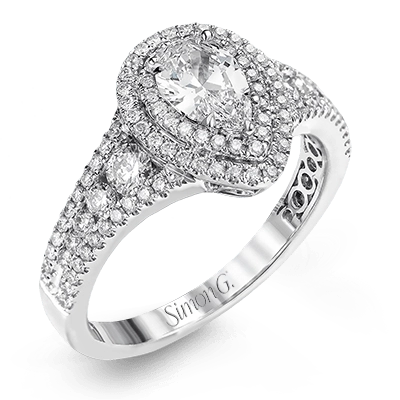Featuring a pear-shaped double halo, this modern white gold engagement ring is highlighted by .68 ctw of round cut white diamonds.