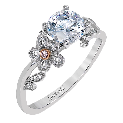 Featuring delicate floral designs on the shank, this modern white gold ring is complemented by .19 ctw of round cut white diamonds and .02 ctw pink diamond accents.