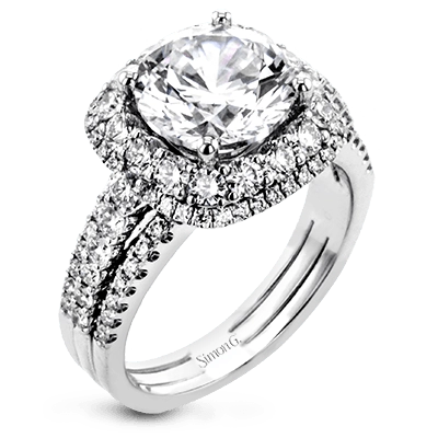Featuring a brilliant halo setting, this contemporary white gold ring is set with 1.35 ctw glistening round cut white diamonds.