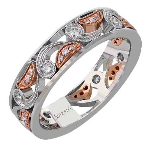 Featuring a distinctive paisley design, this modern white and rose gold band is accentuated by .30 ctw round cut white diamonds.