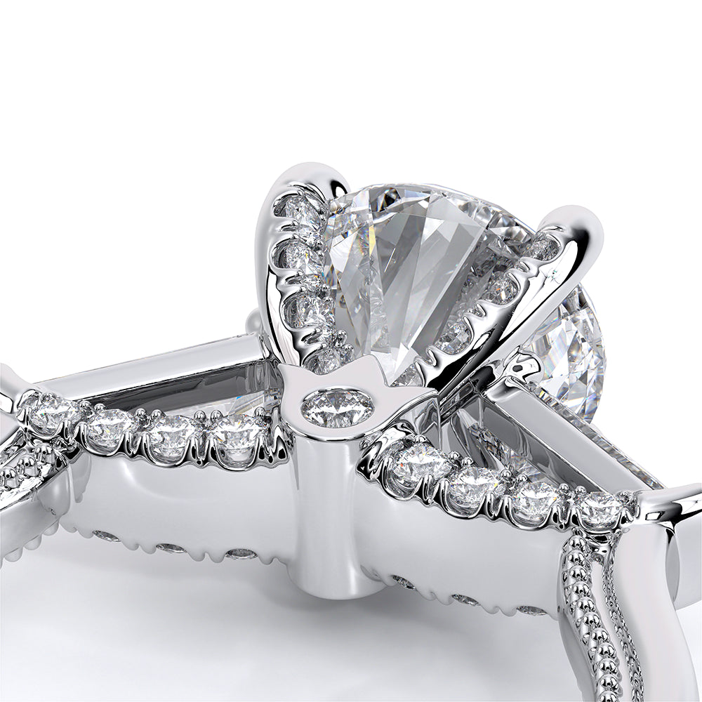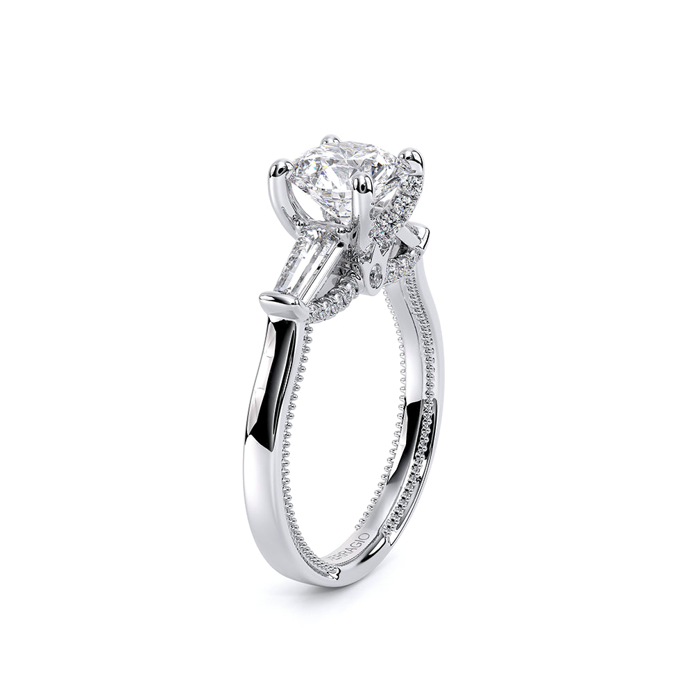 Renaissance-991R-S is a captivating three-stone engagement ring featuring baguette diamonds. Pave diamonds beautifully frame your center stone; the simple shank adorned with delicate milgrain detail elevates this ring with vintage charm. The Verragio signature crest completes the refinement of this piece.