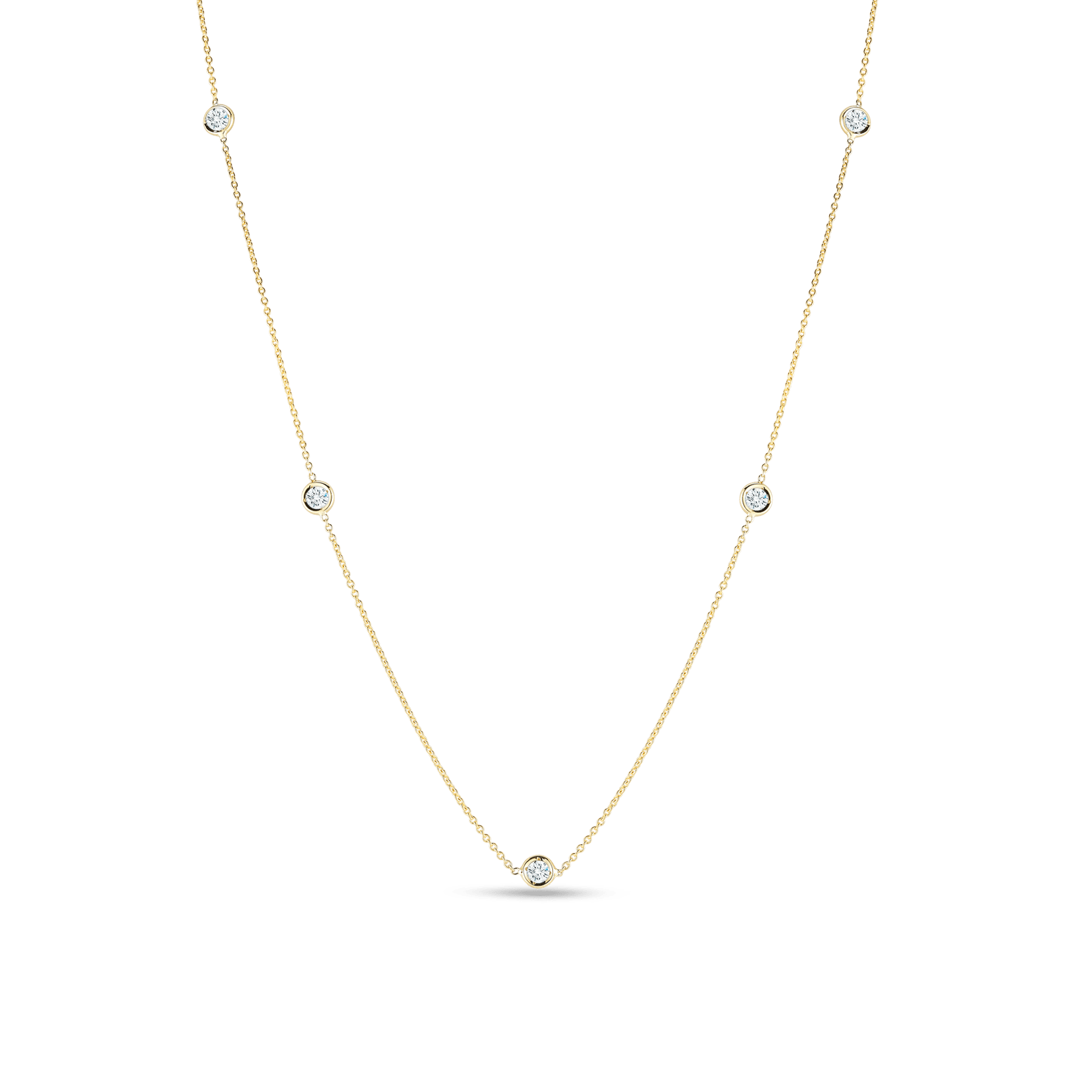 Crafted in 18K gold, this Diamonds by the Inch necklace features five sparkling diamond stations set along a fine chain. Each diamond catches the light with subtle brilliance, creating refined shimmer and understated elegance. Perfect for layering or wearing alone, this necklace offers timeless style and versatile sophistication for any jewelry collection.