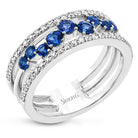 This ring features a meandering path of .65 ctw offset sapphires in it midst, flanked by .38 ctw white diamonds along the edges.
