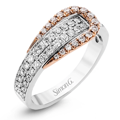 The eye-catching buckle design of this contemporary white and rose gold ring is highlighted by .65 ctw of round cut white diamonds.