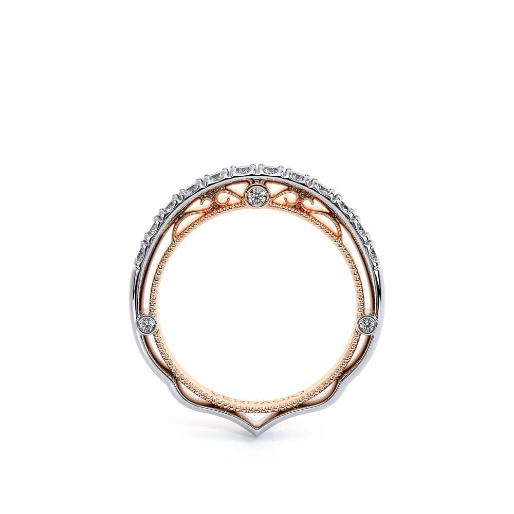 VENETIAN-5080W from the Venetian Collection, is a straight band featuring round brilliant diamonds. The inside profile showcases three bezels set round diamonds along with lace & signature beading. Complete your Verragio look by customizing your bridal set today.