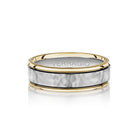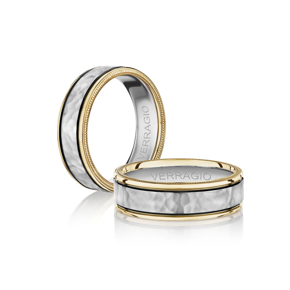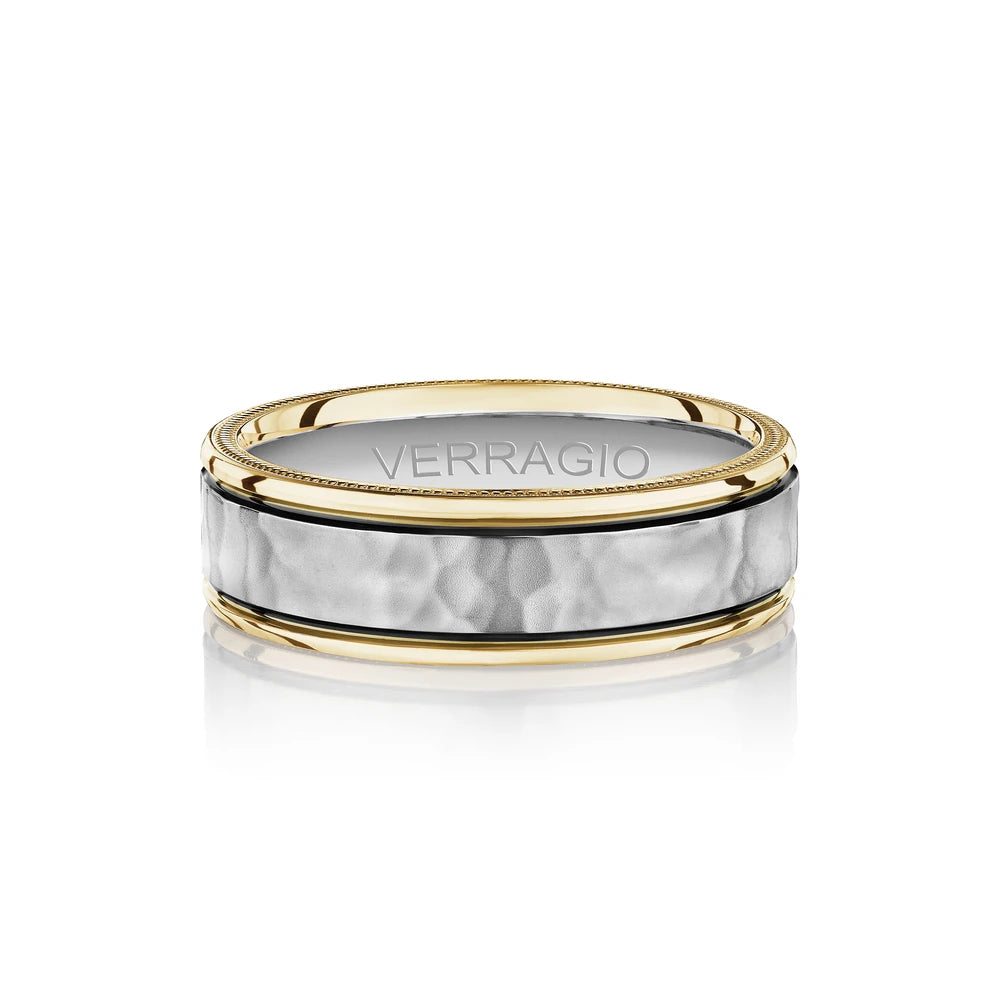 Verragio's VWB-7010HM men's wedding band features a stunning hammered finish with milgrain edging and a touch of rhodium accents, creating a unique and eye-catching look.